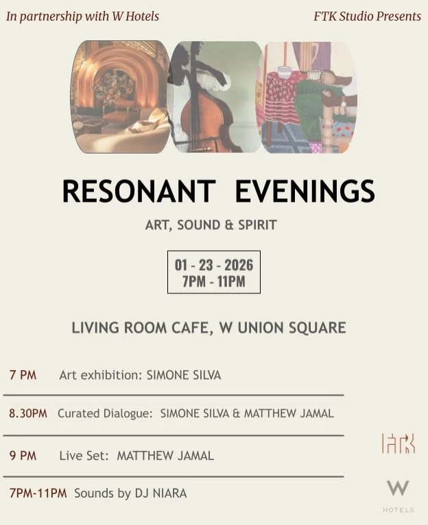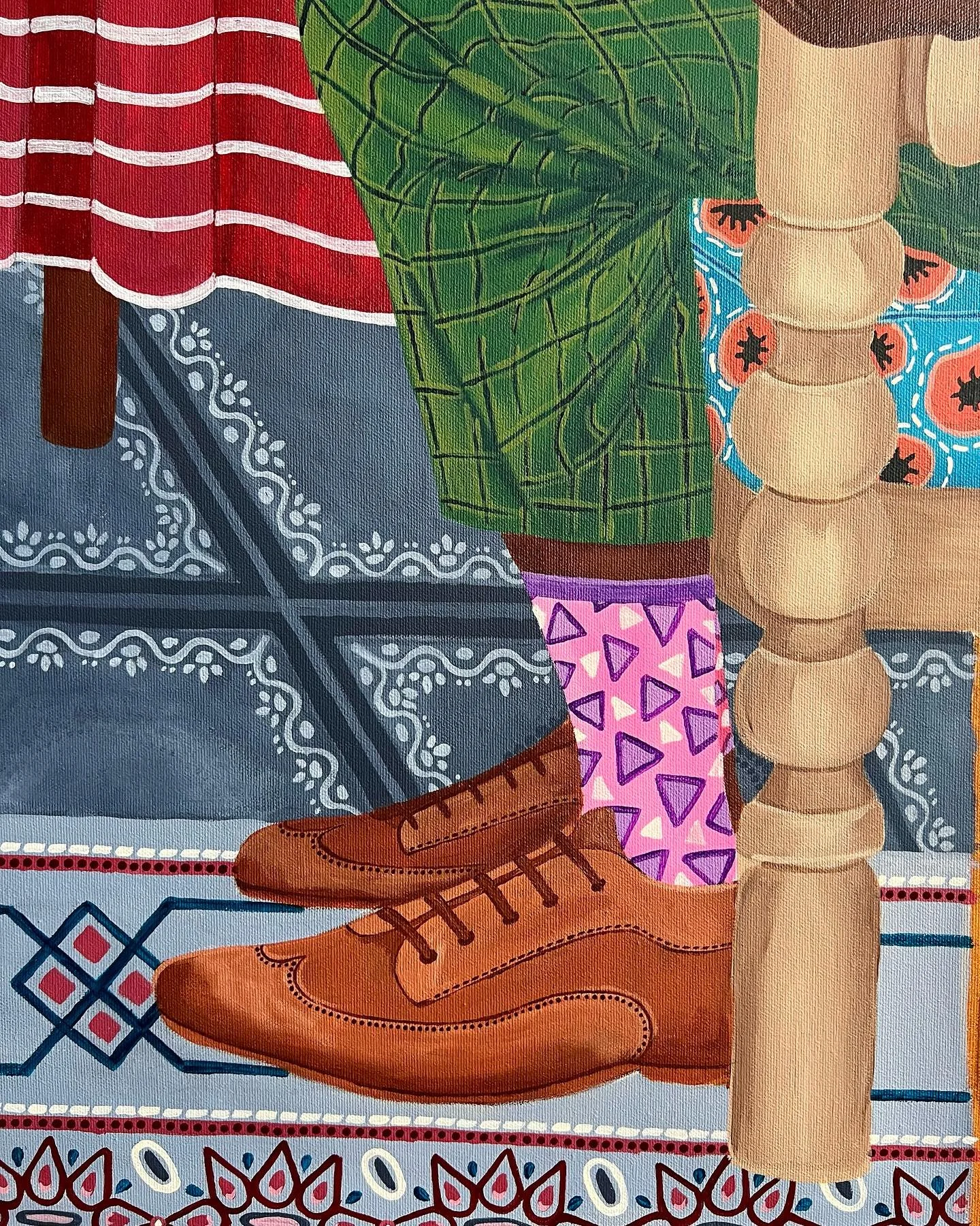 My paintings are known for their vibrant, contrasting colors. I don’t work with a predefined palette; instead, I trust my instinct, placing colors to make the patterns pop. Patterns play a central role in my work — they are not just surface treatments, but structures that anchor the composition. I invent them intuitively, drawing inspiration from forms found in nature, household textiles, vintage tiles, African symbolism, particularly Adinkra motifs, and devotional artifacts. Pattern, for me, becomes a visual language — it holds memory, creates movement, and connects each figure to the space they occupy. During the underpainting phase, I establish the foundation of the color structure, using hue and value to define the direction the colors will take. A piece feels complete when every element is linked through pattern — when in my eyes the composition speaks with consistency, rhythm, and balance.