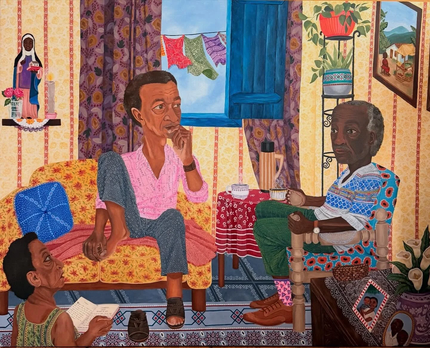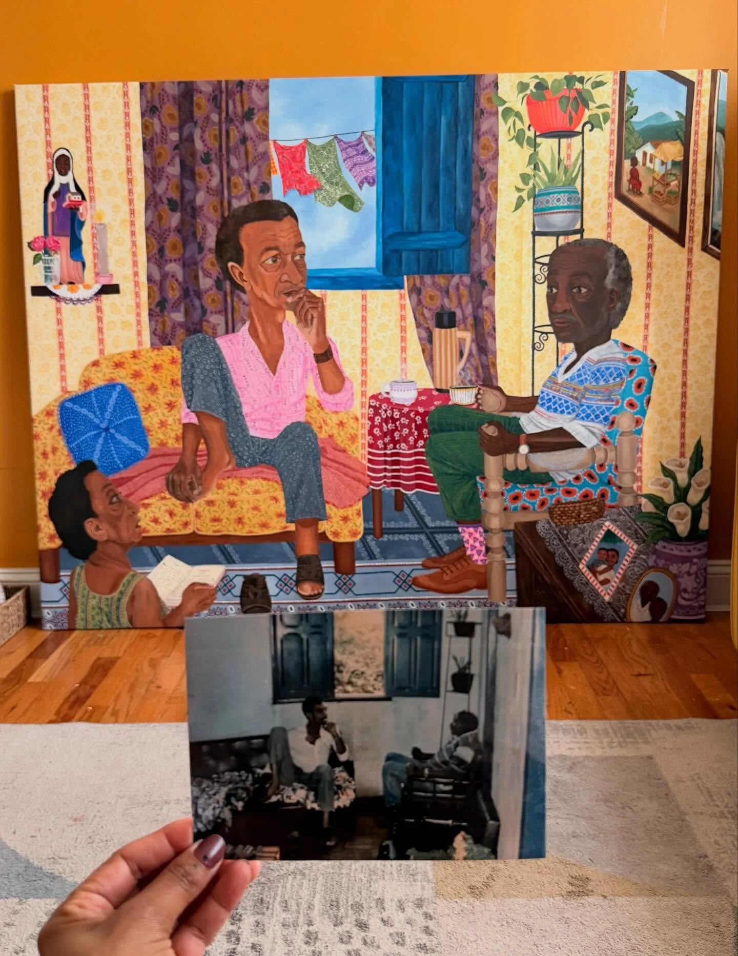 Grounded in familiar moments, my work incorporates symbolic domestic elements that evoke shared cultural memories. Through these narratives, I honor and uplift my community, exploring the intimacy and spiritual symbolism of Black Brazilian life. I invite viewers to reflect on their own stories, recognizing connections across time, place, and identity.